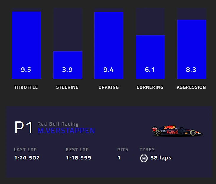 Рейтинг, если что, высчитывается из данных телеметрии, снимаемых со всех гоночных машин, и формируется с оценкой от 1 до 10 в сравнении с показателями соперников. Данные обновляются каждые пять секунд.