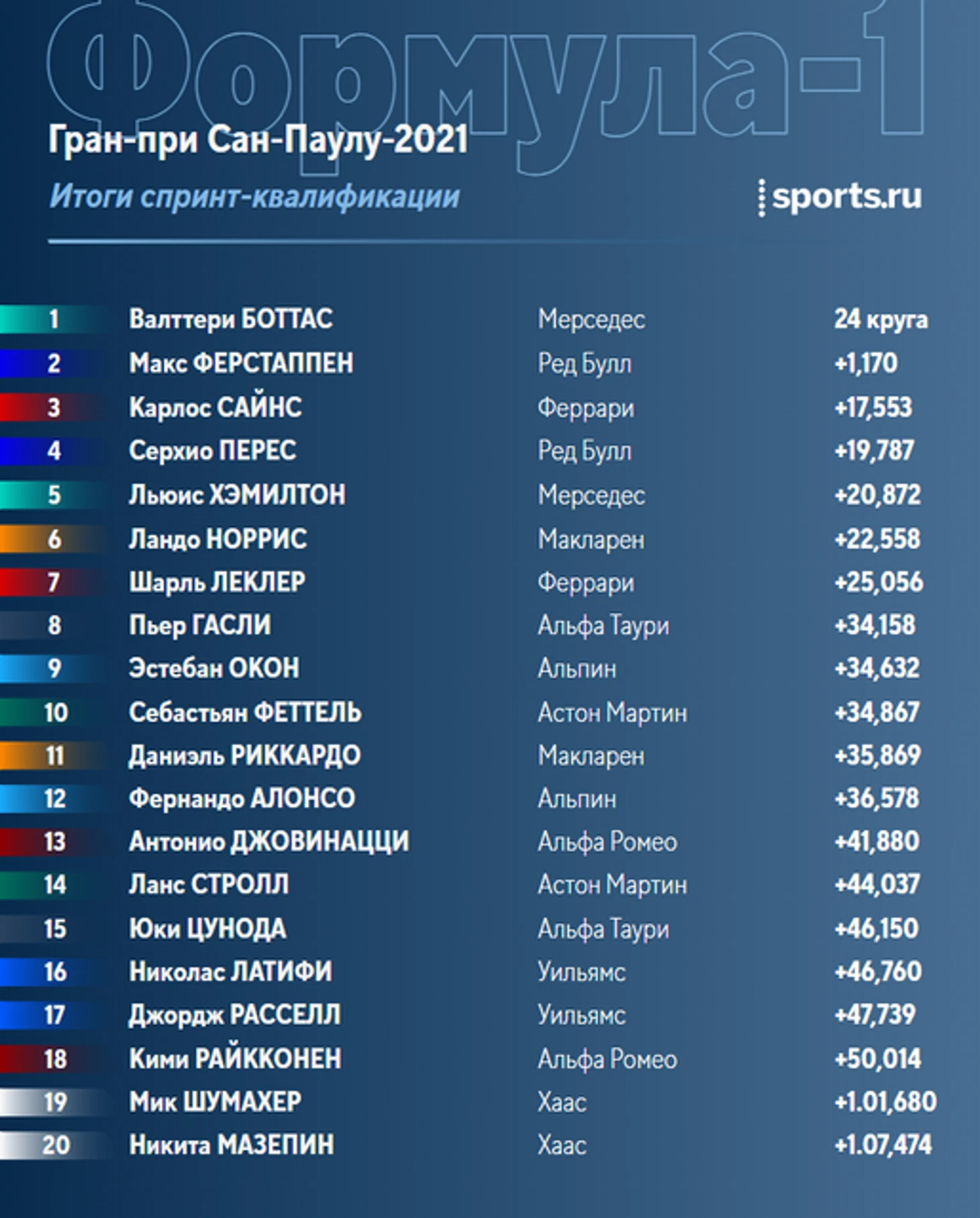 Валттери Боттас выигрывает спринт в Сан-Паулу и именно он начнет завтрашний Гран-при с поула! Ферстаппен финиширует вторым, Сайнс удержал третье место!