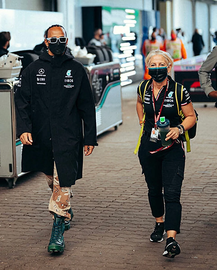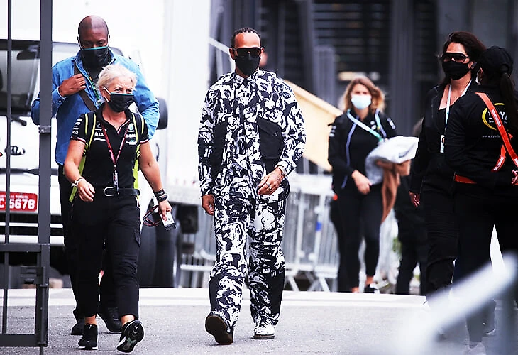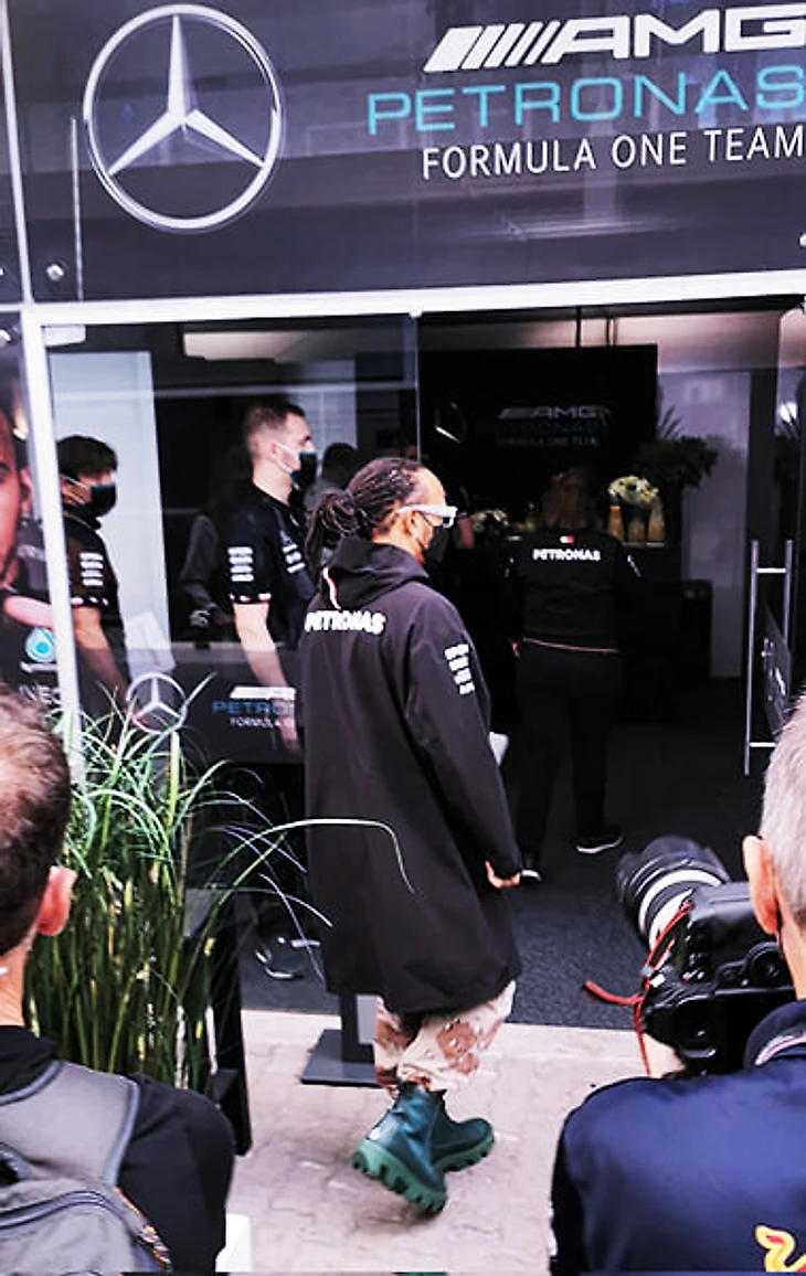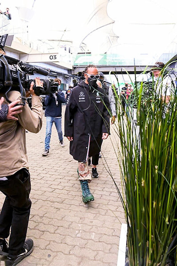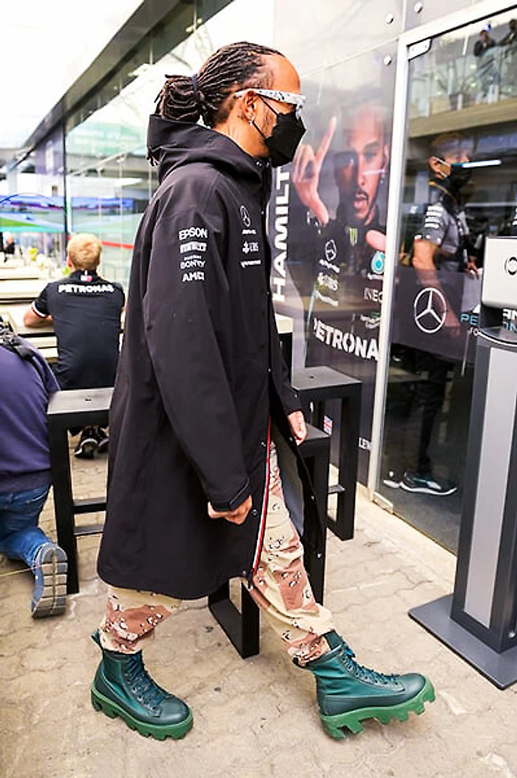 Но перед заездом субботу посвятили разбирательствам – технические делегаты проводили проверки, а стюарды вызвали гонщика на слушания. Туда Льюис заявился, не подстраиваясь под чужие ожидания – в черном командном оверсайз-плаще; в светлых штанах в камуфляжном узоре; и самой привлекательной частью наряда – ярко-сине-зеленых кожаных сапогах с высокой подошвой.