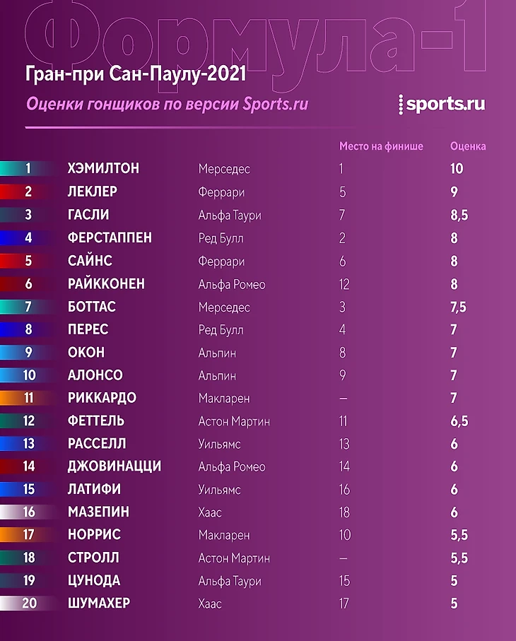 Рейтинг Sports.ru за Гран-при в Бразилии: Хэмилтон – идеален, Мазепин лучше Шумахера, Ферстаппена нет в топ-3