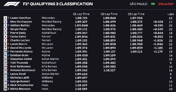 3. На заключительной попытке становиться очень волнительно, кто же сможет забрать поул? Льюис или Макс, кто покажет себя лучше? У Макса возникают проблемы с перегревом шин в первой попытке, а во второй и вовсе совершает ошибку, что позволяет Льюису взять еще один поул и отдалиться от Ферстаппена на 0,438 секунды. Гасли снова лучший из остальным - 5-ая позиция на старте Спринта, а Ferrari следом за ним.