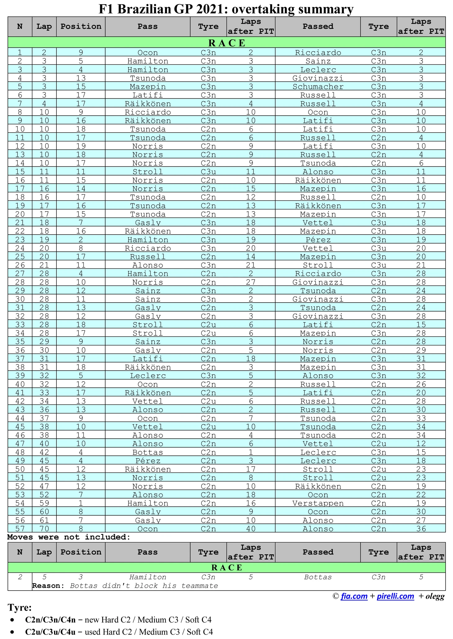 - Pass, Tyre, Laps after PIT - пилот, который обогнал, тип шин и кругов после пит-стопа
