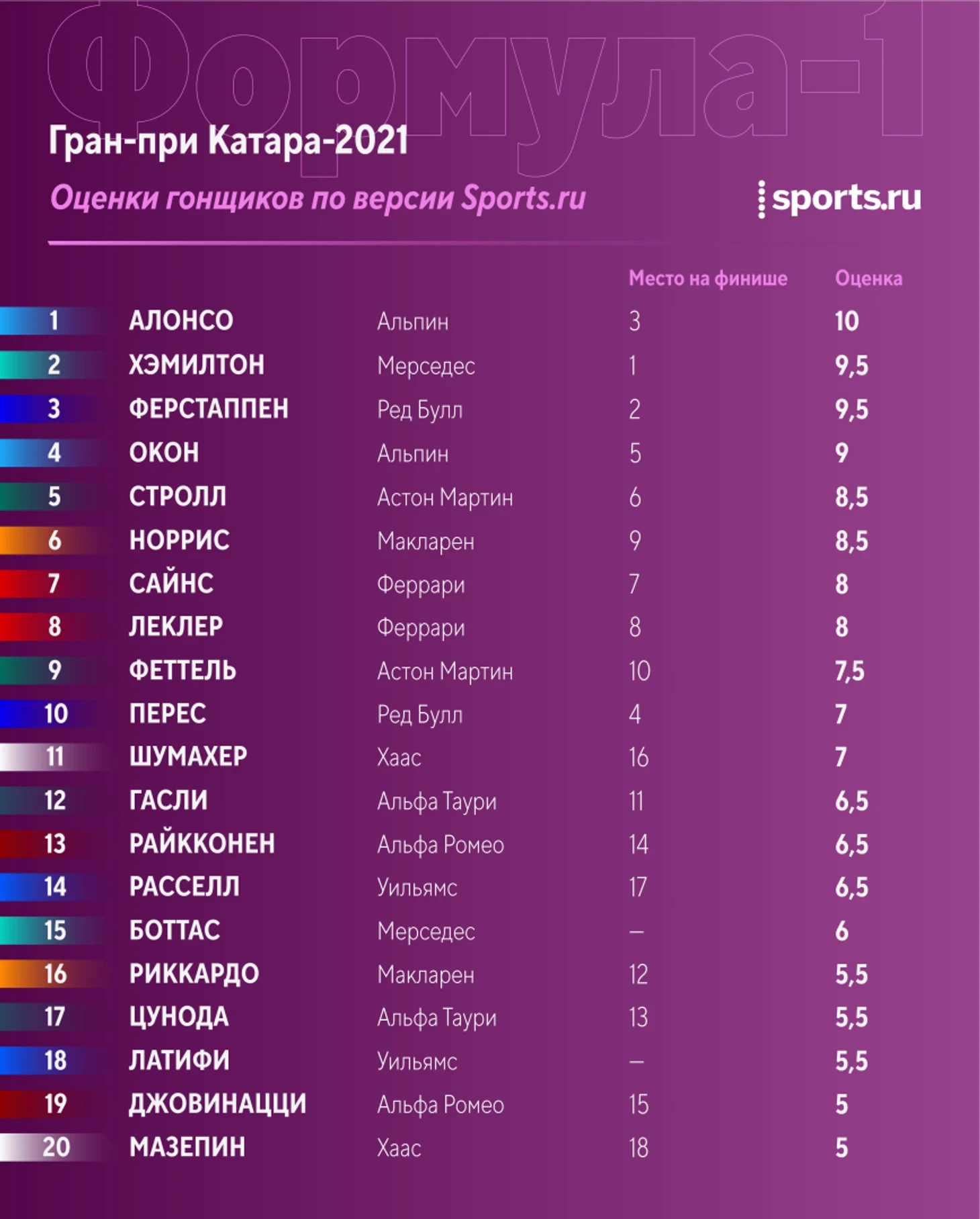 Алонсо – лучший на Гран-при Катара по версии Sports.ru и зарубежной прессы, Шумахер выше Боттаса, гонщики «Феррари» слабее Стролла