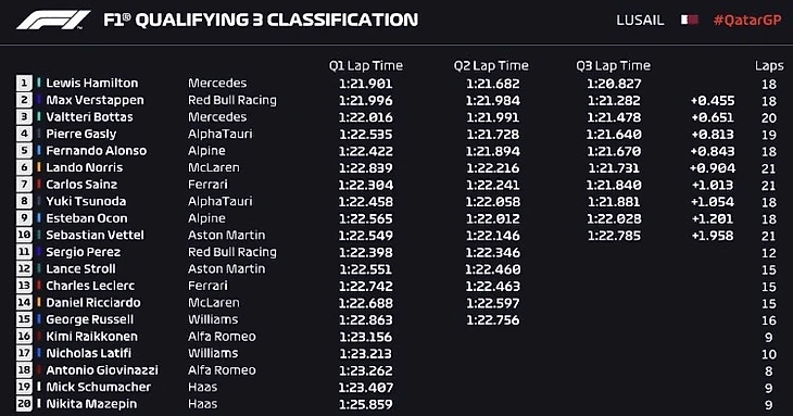 3. После первой попытки в третьем сегменте мерседесы занимают 1-ое и 3-ье места, а между ними с отрывом от Льюиса в 0.162 секунды Макс Ферстаппен. Лучшими после двух сильнейших команд стали Пьер Гасли и следом за ним Фернандо Алонсо. В заключительной попытке Льюис первым пересекал финишную черту и он смог показать потрясающее время 1: 20: 827 (-0.435 секунды от первой попытки). За ним пересек черту Валттери Боттас, который замедлился на втором секторе, как и Макс Ферстаппен из-за желтых флагов, вызванных Гасли (прокол шины). Льюис забирает свой поул, а неожиданным в данной квалификации стала стартовая позиция Фернандо - 5-ый.