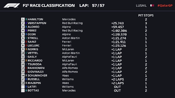 На 51-ом круге второй прокол - Джордж Расселл. Также в это время в боксы заезжает Боттас и сходит с гонки, не принося команде ни одного очка. Ранее на 50-ом круге заезжает с медленным проколом Ландо Норрис, который до этого был на прекрасной 4-ой позиции, очень обидно для болельщиков и команды в целом, особенно сейчас в ожесточенной борьбе с Ferrari. На 52 круге прокол у Николаса, который завершился его сходом. Льюис выигрывает данный Гран-При, а вместе с ним на подиум поднимается Макс, взявший лучший круг, и Фернандо Алонсо, который провел просто невероятную гонку!