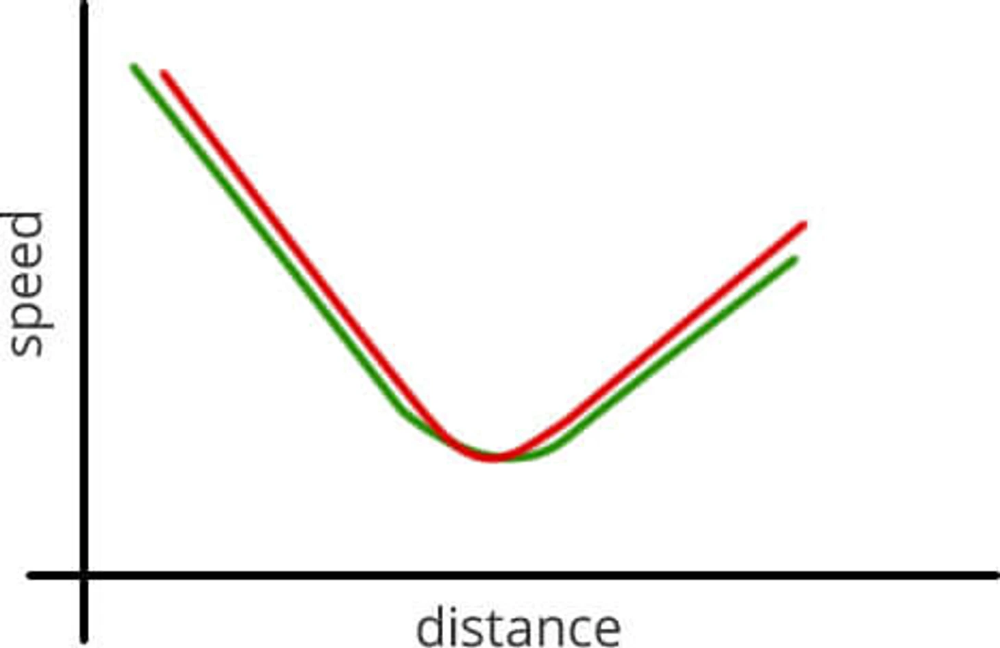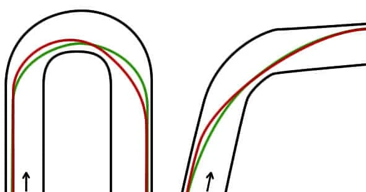 Зеленая линия – геометрическая траектория, красная линия – гоночная траектория.