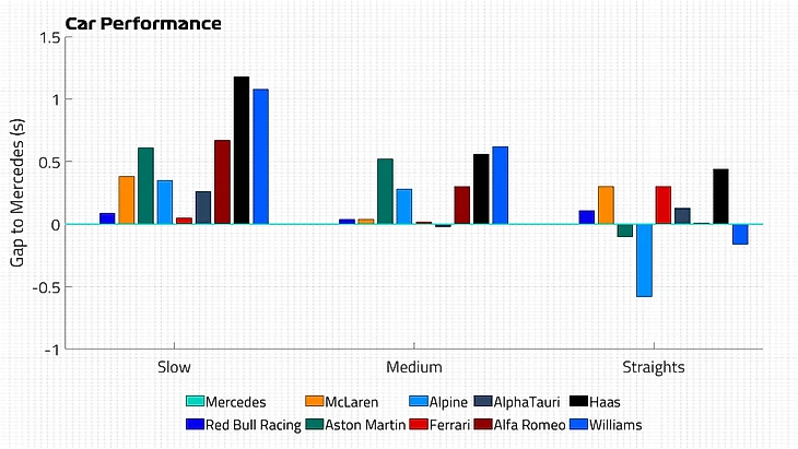 Смотрите: RB16B уступает W12 совсем чуть-чуть, буквально в районе 0,1 секунды в разных типах зон трассы – в принципе, вся разница может лежать в плоскости настроек, а не радикального преимущества одного болида над другим.