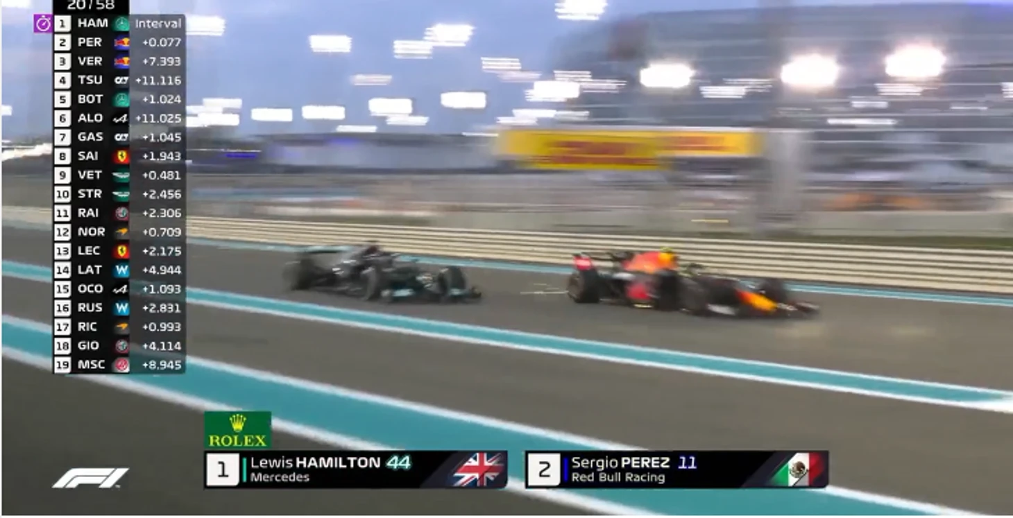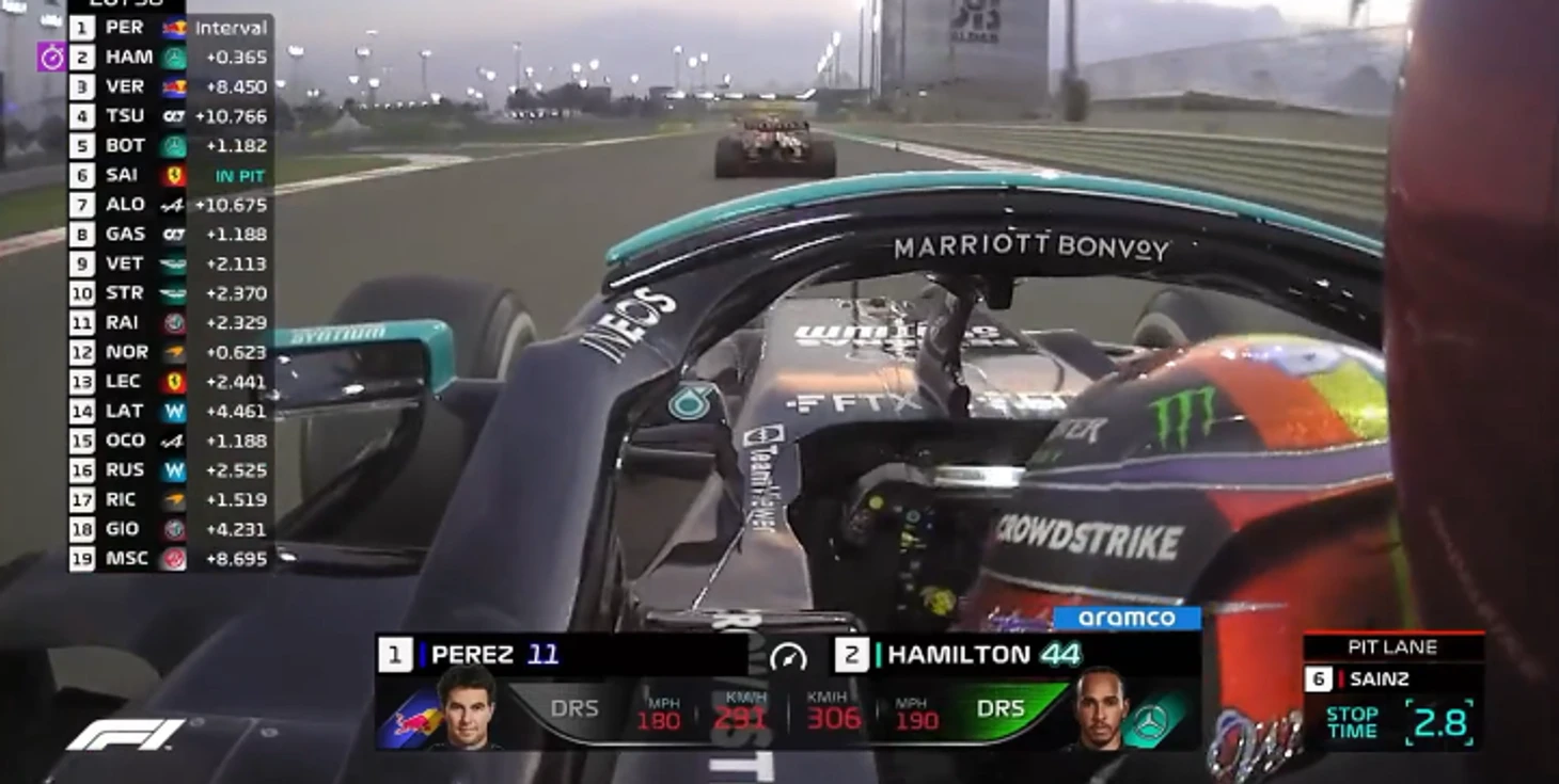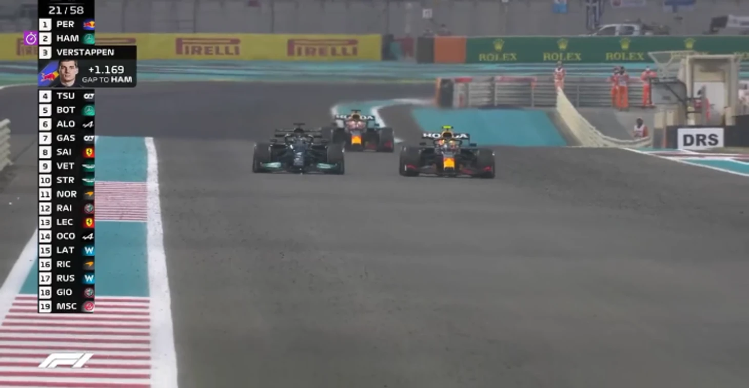 Хэмилтон настигает Переса на прямой с DRS и ныряет на внутреннюю – классический обгон по учебнику без шансов для мексиканца…