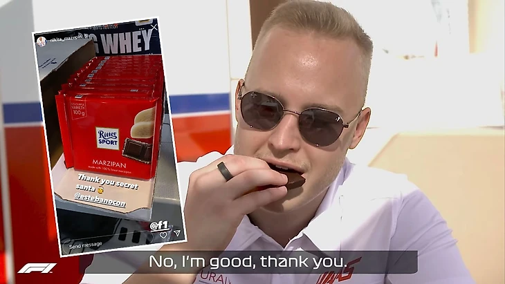 Сам Никита получил целую коробку шоколада со вкусом марципана (это такая шутка с отсылкой к фамилии пилота «Хааса») от Эстебана Окона.