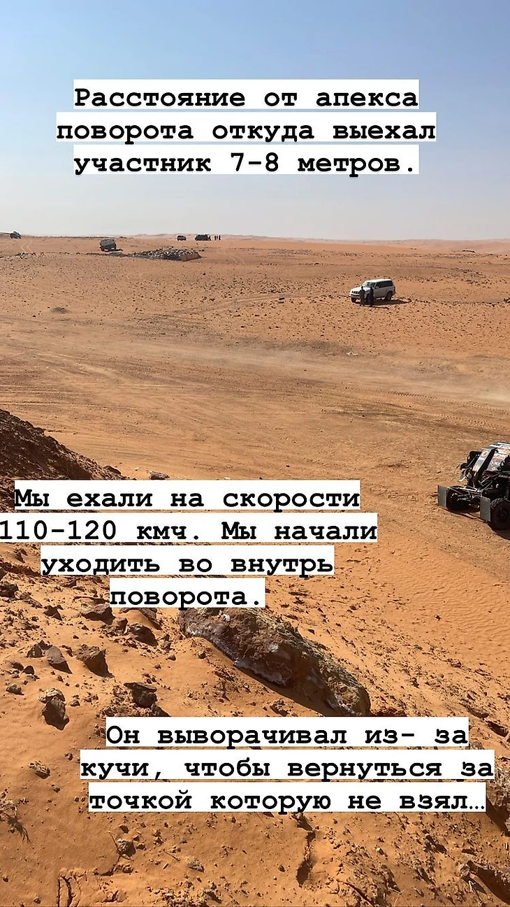 Однако судя по легенде маршрута и местности, оба просто не ожидали лобовой встречи с кем-либо на такой скорости в том месте – а раллийные багги все-таки не шоссейные болиды и способны остановиться в песках за 7-8 секунд. Так что зря, наверное, Карякин материл итальянца.