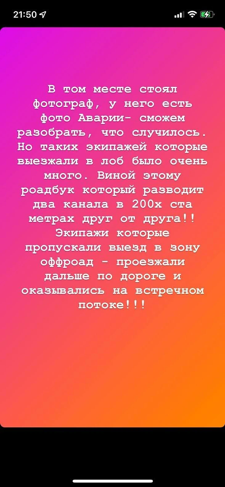 «Машины не подлежат восстановлению… Да **** с машинами, для нас гонка закончена! Авария произошла примерно на скорости 100 км/ч. Вот оттуда они выехали и попали нам прямо навстречу. У его штурмана, по ходу, перелом позвоночника.