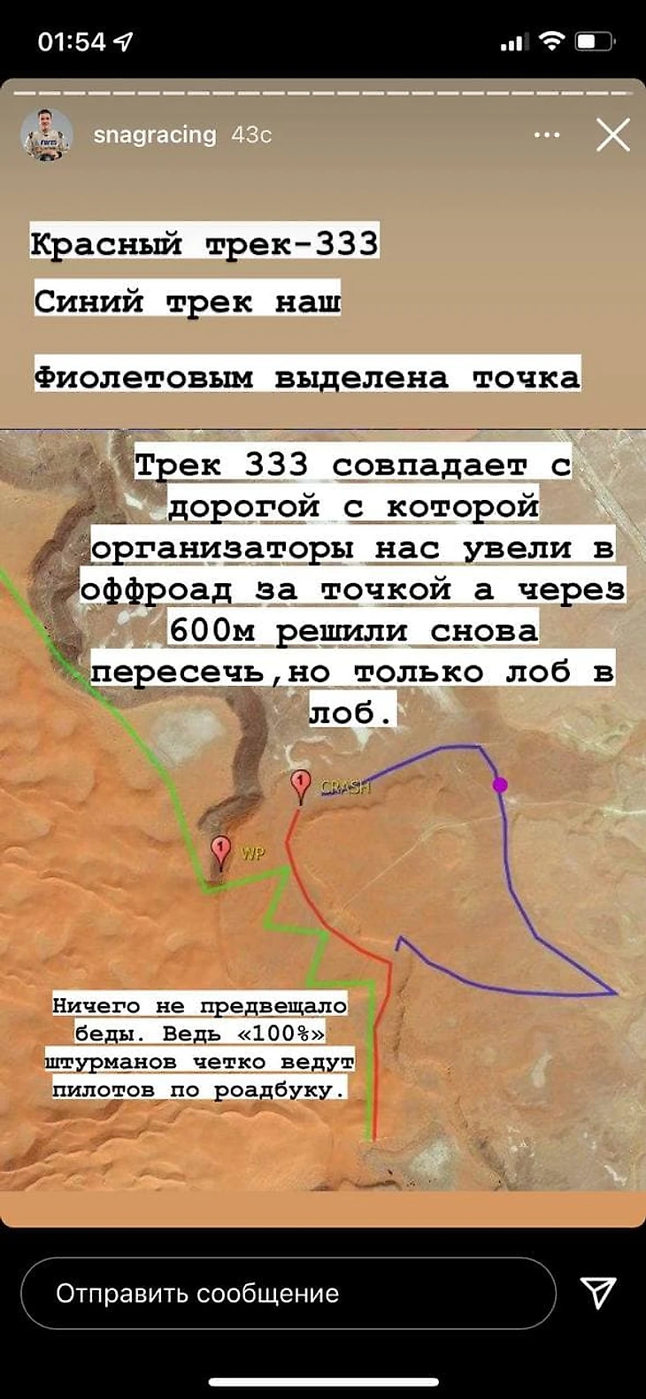 «Трек №333 совпадает с дорогой, откуда организаторы нас увели в оффроад, а через 600 метров решили пересечь, но лоб в лоб. Ничего не предвещало беды, ведь штурманы ведут по роудбуку».