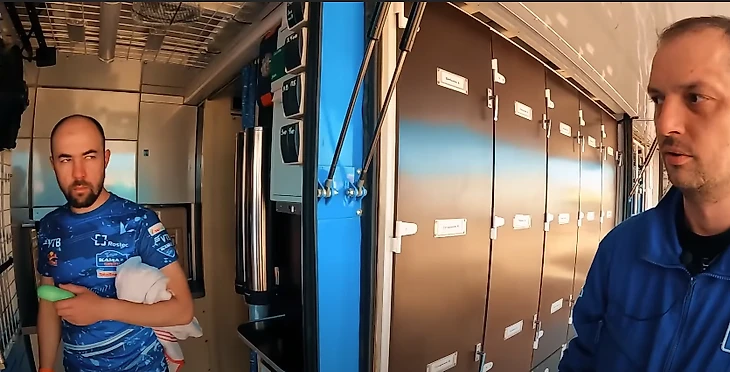 В каких же условиях отдыхают механики, ремонтирующие чемпионские «КАМАЗы»? Что можно найти в их суперкараване? Правда ли, что там повсюду детали, холодильники с едой буквально стоят рядом с верстаками, и у ребят есть даже специальный кран для кваса? Русская команда все показала в одном из выпусков «Путевых заметок».