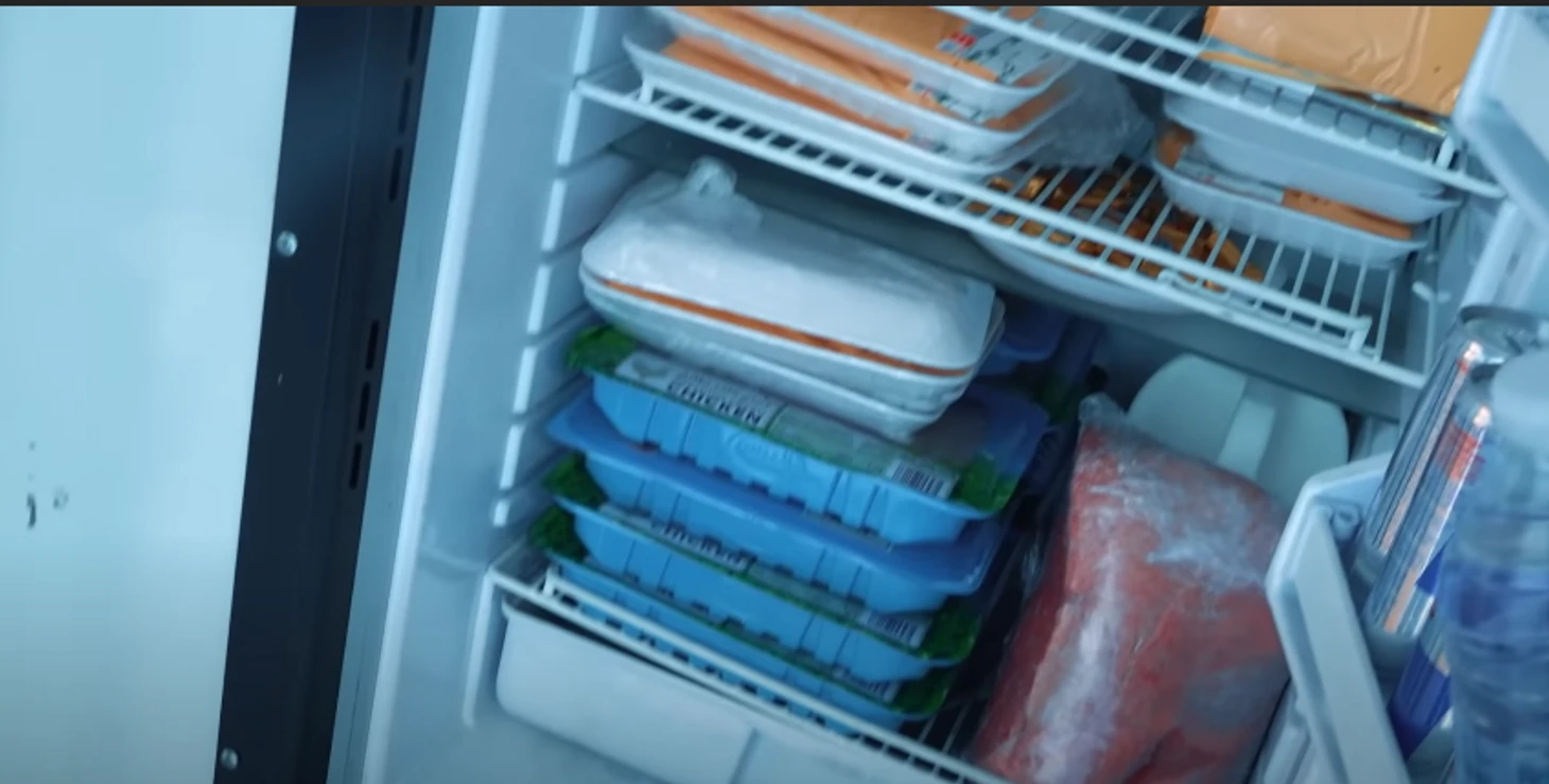 Холодильник, полный еды и напитков – от спонсорского «Ред Булл» до куриного филе…