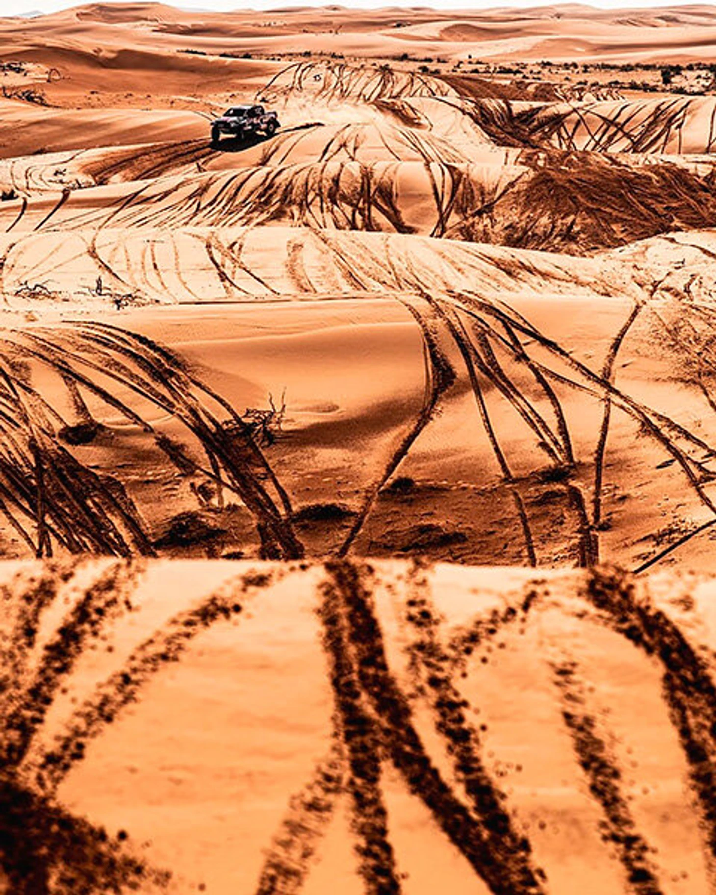 Потому к концу гоночного дня пустыня выглядит примерно вот так – один из спецучастков в 2022-м даже сократили из-за чрезмерно разбитой и опасной колеи.