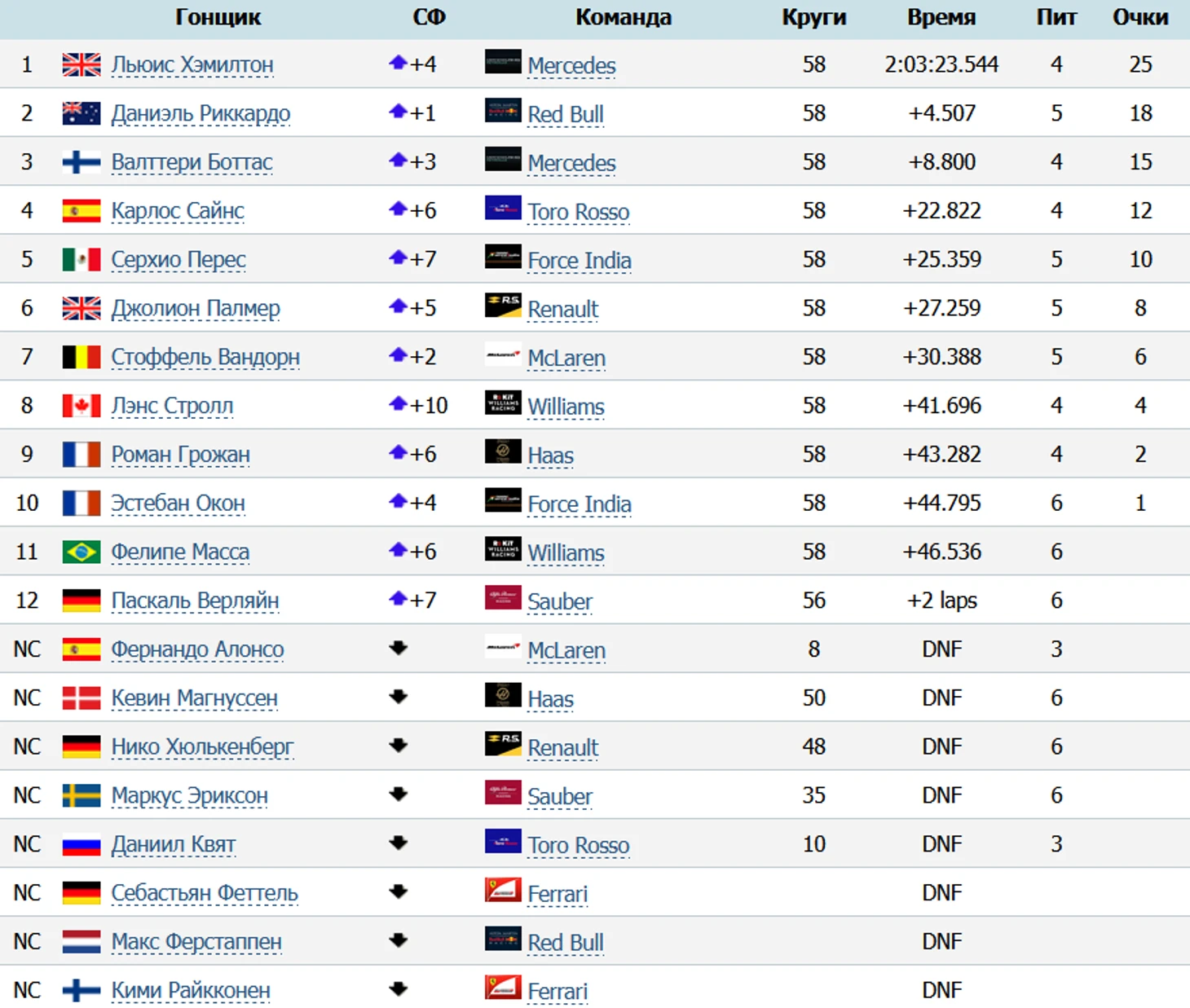 Рестарт на 41 круге. Двухчасовой лимит подходил к концу, поэтому вместо оставшихся кругов показали обратный отсчет. За 13 минут до финиша сходит Нико Хюлькенберг, а за 10 - Кевин Магнуссен. У обоих возникли проблемы с мотором. Гонка закончилась после 58 кругов, где первую позицию забрал Льюис и оторвался на 28 очков от Себастьяна в личном чемпионате. Вторым стал Риккардо, а третьим - Боттас. Нужно отметить финишные позиции Карлоса (4-ый) и Серхио (5-ый).