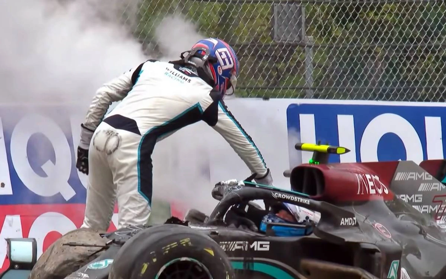 Но сам Валттери также был замечен в демонстрации среднего пальца. Злопыхатели поспешат сказать, что так он поприветствовал Джорджа Рассела в новой команде (напомним, британец как раз сменит финна в «Мерседесе» со следующего сезона), но на самом деле все проще: произошла авария, молодой пилот «Уильямс» подошел высказаться конкуренту в лицо, на что у Валттери был один неоспоримый контраргумент.