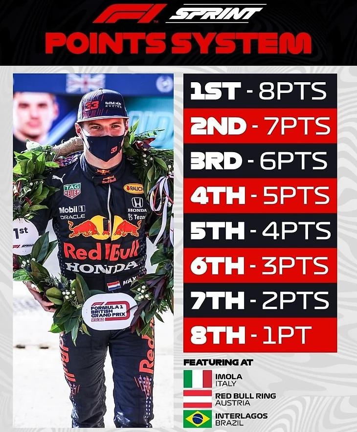 В предстоящем сезоне Формулы-1 2022 года будут проведены три спринта, на Гран-При Эмилии-Романьи, Австрии и Бразилии. Однако система начисления баллов притерпела серьёзные изменения. В новом сезоне вместо трёх пилотов получающих очки по системе 3-2-1, очки будут получать 8 пилотов по системе 8-7-6-5-4-3-2-1.