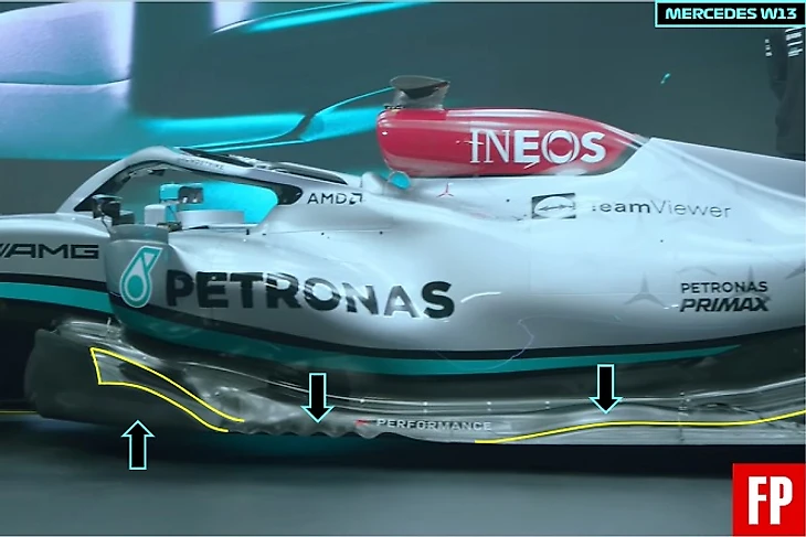 Профили боковых понтонов с обтекателями днища не имеют ни нижнего канала, как на «Астон Марти», ни размеров и нетипичных выемок «Феррари» F1-75, как и отсутствует нисходящая "горка", предложенная «Альфа Таури». «Мерседес» имеет небольшой нисходящий изгиб в верхней части боковых понтонов, но в остальном формы кузова направлены на обеспечение компактных размеров. В отличие от «Феррари», которая предпочитает потоки в верхней части понтонов, здесь же есть достаточно места для циркуляции воздуха в нижней части, направляя потоки в большей степени к днищу в пользу эффективности диффузора и нагрузки, создаваемой днищем.