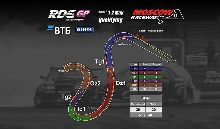 В нем объясняется, как оцениваемый участок поделен на отрезки и какое количество баллов на них можно заработать: как проходить «клиппинг зоны» и «тач-н-гоу» (если не знаете, что это такое — читайте этот пост, где мы рассказываем о терминах дрифта) и даже то, в какой технике надо преодолевать те или иные отрезки оцениваемого участка.