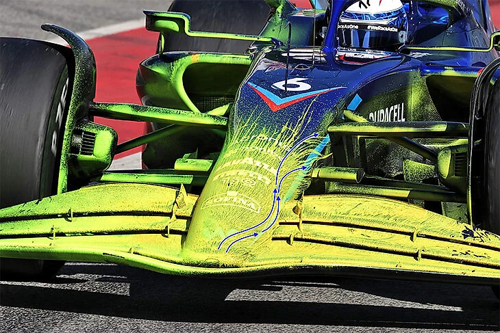Дело в традициях: краска (логично) появилась намного раньше – еще в 80-х – и потому опыт ее использования и снятия результатов намного обширнее. К тому же, обливать ею машины быстрее, чем устанавливать, снимать, расшифровывать и сопоставлять собранную телеметрию – на тестах иногда важен каждый час, а для некоторых деталей важнее общую верность выбранного направления без высчитывания точной разницы. Ведь если какая-то новинка однозначно не работает, разница в промашке на 2-3% не существенна – лучше сразу сменить условное антикрыло на другую версию и попробовать снова. «Флоу-виз» тогда помогает сориентироваться быстрее, а «решетка» с сенсорами служит уже для более детального уточнения и корреляции данных с результатами симуляций.
