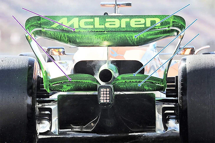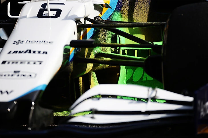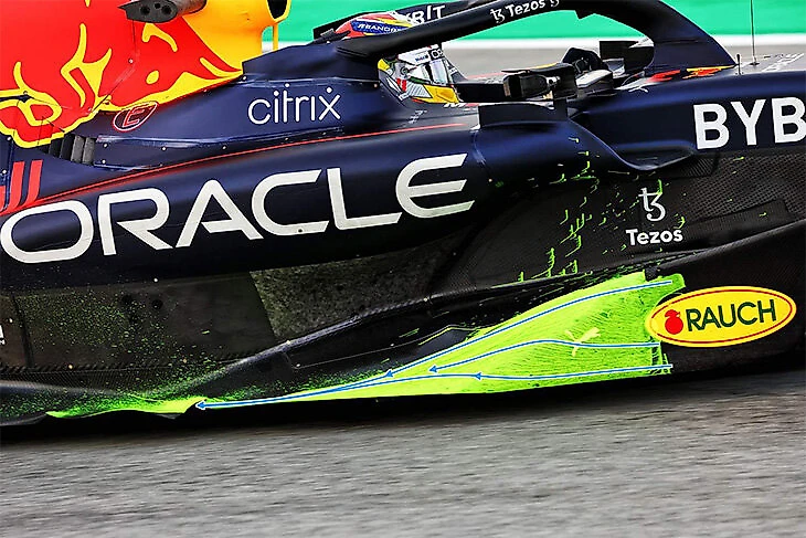 Это «флоу-виз» – в оригинале flow-vis, сокращение от «Flow-visualisation paint» – «краска для визуализации потоков». Название, в общем-то, раскрывает ее назначение полностью: с ее помощью инженеры визуализируют потоки воздуха, обтекающие аэродинамические элементы болидов.