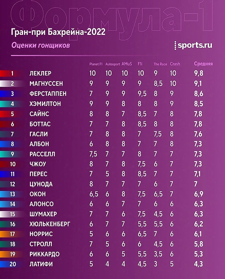 Зарубежная пресса оказалась чуть благосклонней к прошлогодним лидерам Ферстаппену и Хэмилтону – некоторые издания посчитали их выступления почти идеальными, а Цунода расположился ниже, чем в нашем рейтинге. Звезды и неудачники совпали – великолепные Леклер и Магнуссен и потерявшийся Латифи.