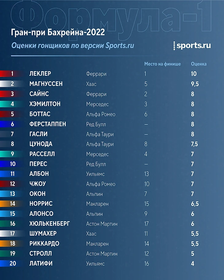 Леклер и сменщик Мазепина порвали рейтинг Sports.ru по Гран-при Бахрейна, Боттас на равных с Ферстаппеном, дорогие пилоты «Макларена» разочаровали