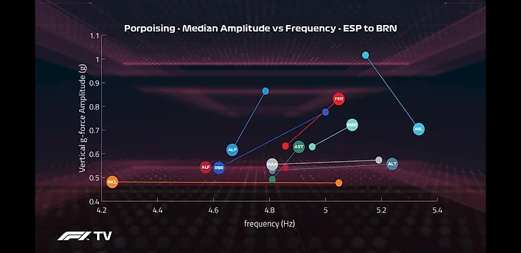 После вторых тестов каждая команда непременно сообщила о нахождении способа победы над галопированием, однако до самого последнего дня обкаток каждый пилот все равно страдал. Вот графика от F1 TV (большая точка – последний тест в Бахрейне) – «Макларен» больше всех снизил частоту и амплитуду колебаний, но не избавился полностью: