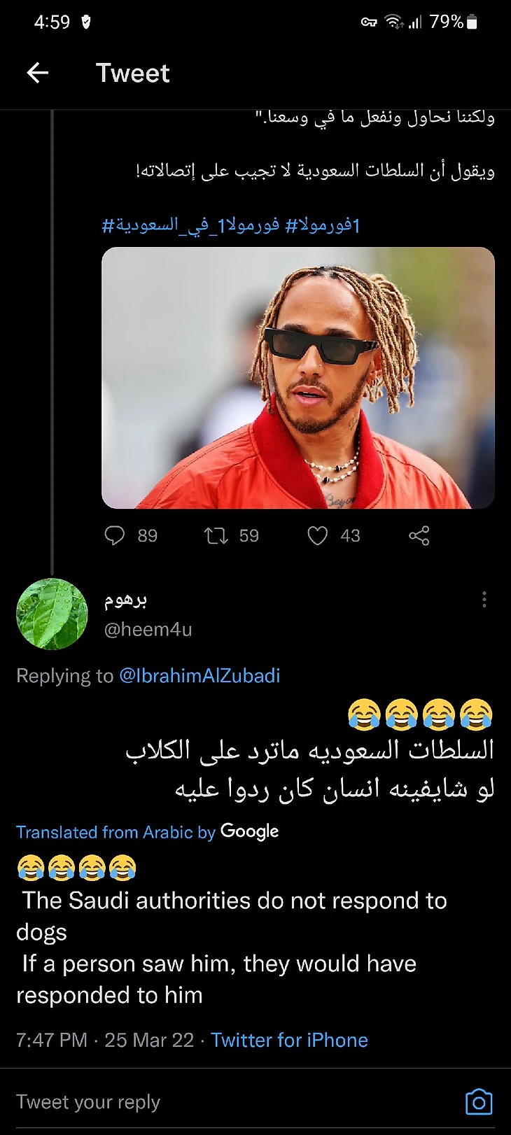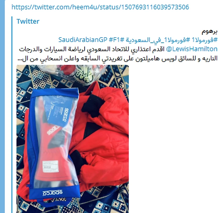 Некоторым саудовцам активизм Льюиса не понравился. Одним из них оказался маршал-пожарный с нынешнего Гран-при (его ник – heem4u). В твиттере он пожелал британцу попасть в аварию вроде крэша Ромена Грожана на Гран-при Бахрейна в 2020-м.