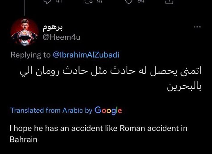 «Надеюсь, он попадет в аварию, как Ромен в Бахрейне», – написал маршал. Аккаунт саудовца (с аватаркой Ферстаппена, кстати) уже удалили.