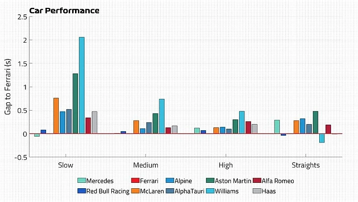 (Первая колонка – медленные повороты, вторая – среднескоростные, третья – быстрые, четвертая – прямые. Бирюзовый столбик – «Мерседес», темно-синий – «Ред Булл», оранжевый – «Макларен», лазурный – «Альпин», синий – «Альфа Таури», зеленый – «Астон Мартин», голубой – «Уильямс», бордовый – «Альфа Ромео», серый – «Хаас». Отрывы сформированы по отношению к «Феррари»).