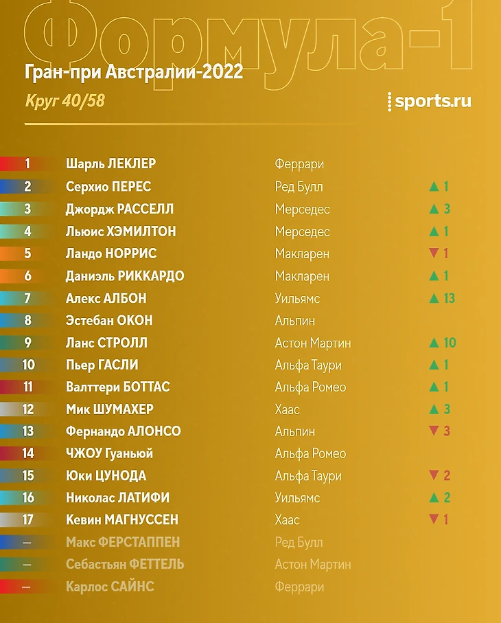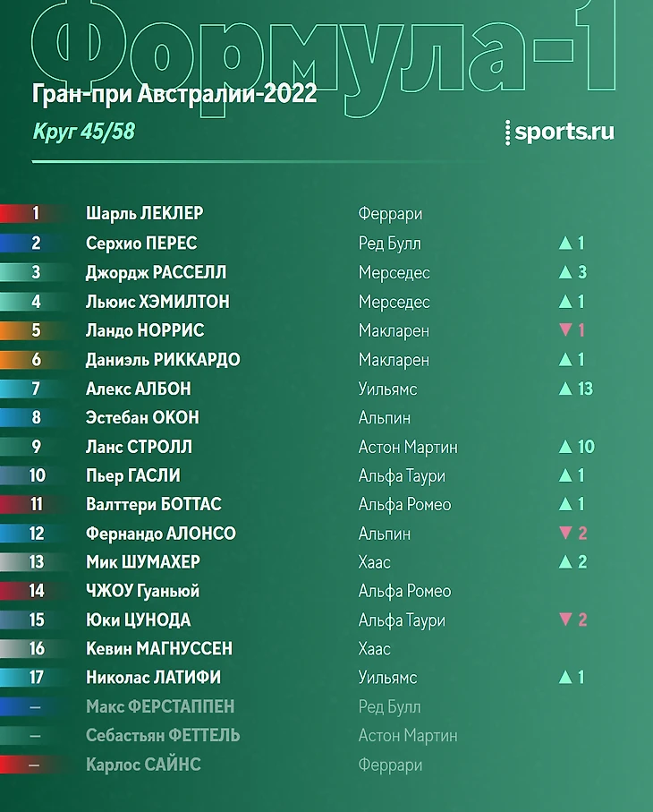 Гонка возобновилась. Преимущество Леклера над Пересом составляет 11,5 секунд. За третье место ждем борьбу между Расселлом и Хэмилтоном.