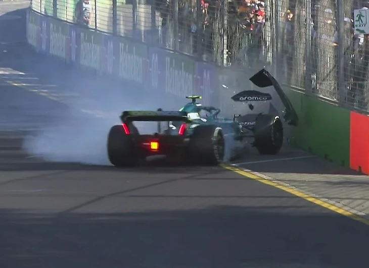 Ага, Феттель не просто так остановился - сначала он потерял машину на выходе из поворота, и та понеслась в отбойники. Мощное ведро - удивился такому необычному поведению техники даже Мартин Брандл.