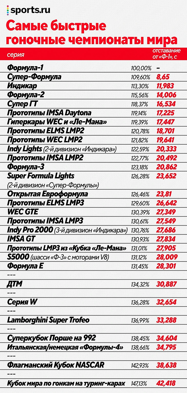 Теперь есть соответствующий рейтинг – журнал Autosport собрал данные более двух десятков серий на одинаковых треках, сопоставил и рассчитал приблизительные отрывы. Базовым уровнем предсказуемо оказалась «Формула-1» – она и стала эталоном в 100% со временем в 90 секунд по предполагаемому усредненному кругу. Остальные – в процентах по времени круга именно относительно «Ф-1» (то есть разница в 9,6% приблизительно равна отставанию на 8,5 секунды с условного круга, например).