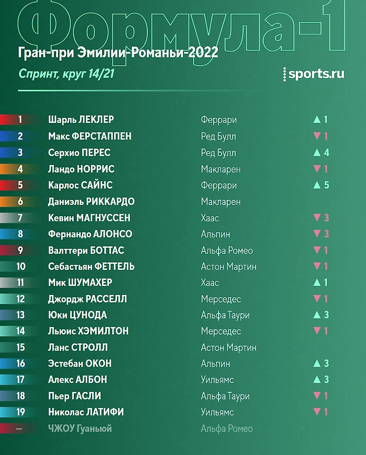 Алонсо же пока упорно отбивается от Боттаса и удерживает восьмое место. Расселл и Хэмилтон вне топ-10 и пока так ничего и не отыграли. Зато Мик Шумахер неожиданно обошел Феттеля в борьбе за 10-е место! Правда, очков за него не дадут.