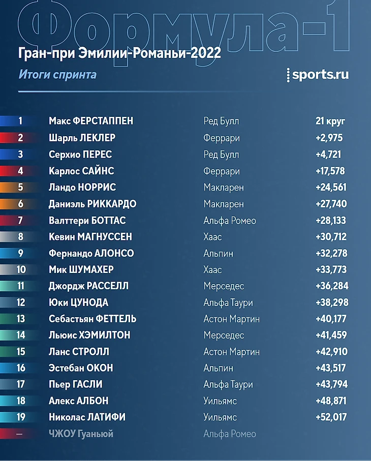 Все, спринт закончился победой Макса! Пожалуй, увиденное и правда можно назвать гонками в концентрированном виде. Мощнейшее сражение Леклера и Ферстаппена. Прорывы Переса и Сайнса тоже получились довольно зрелищными.