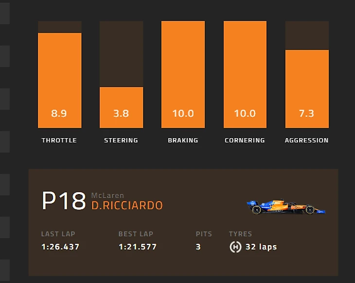 Риккардо идеально отработал торможения и повороты, да и с педалью газа вплотную подошел к идеалу.
