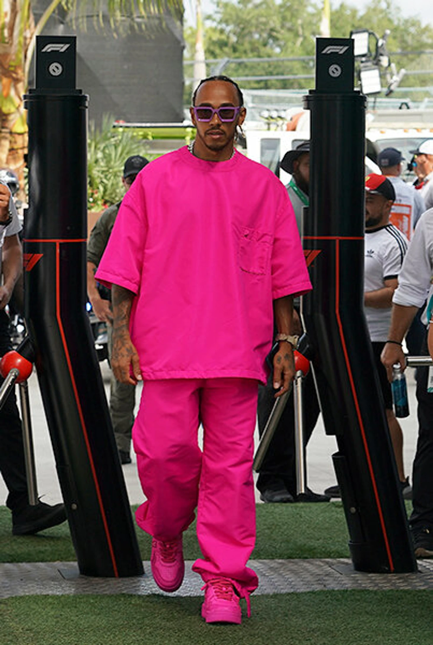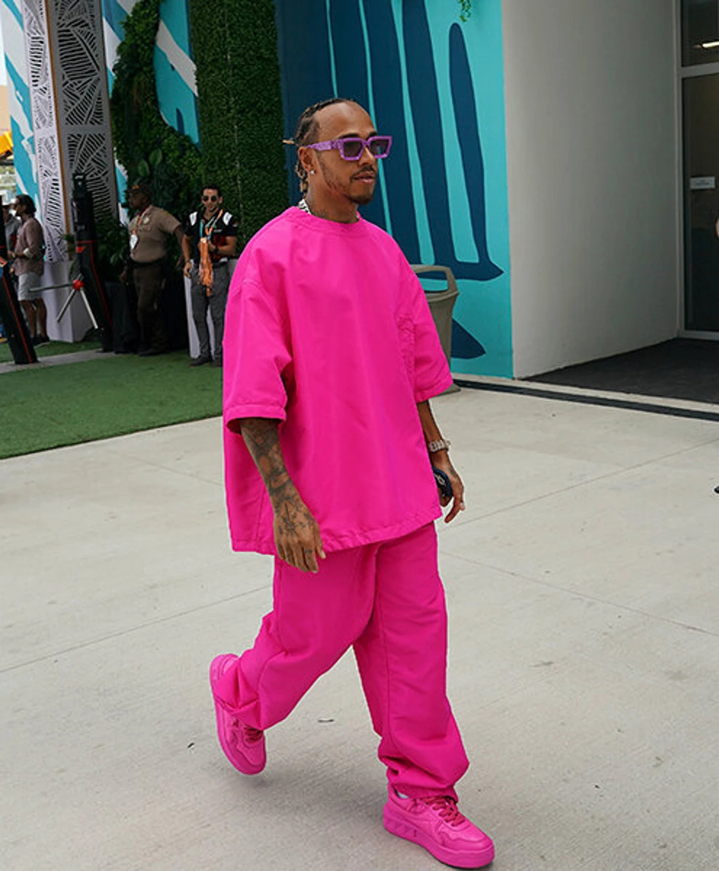 Хэмилтон пропустил главную модную вечеринку года, но забрал оттуда нашумевший розовый костюм. И надел его на Гран-при