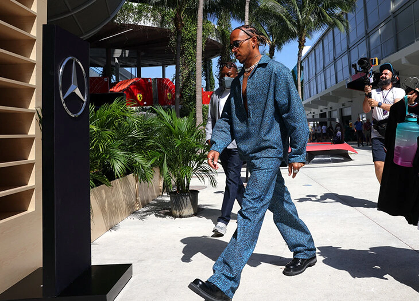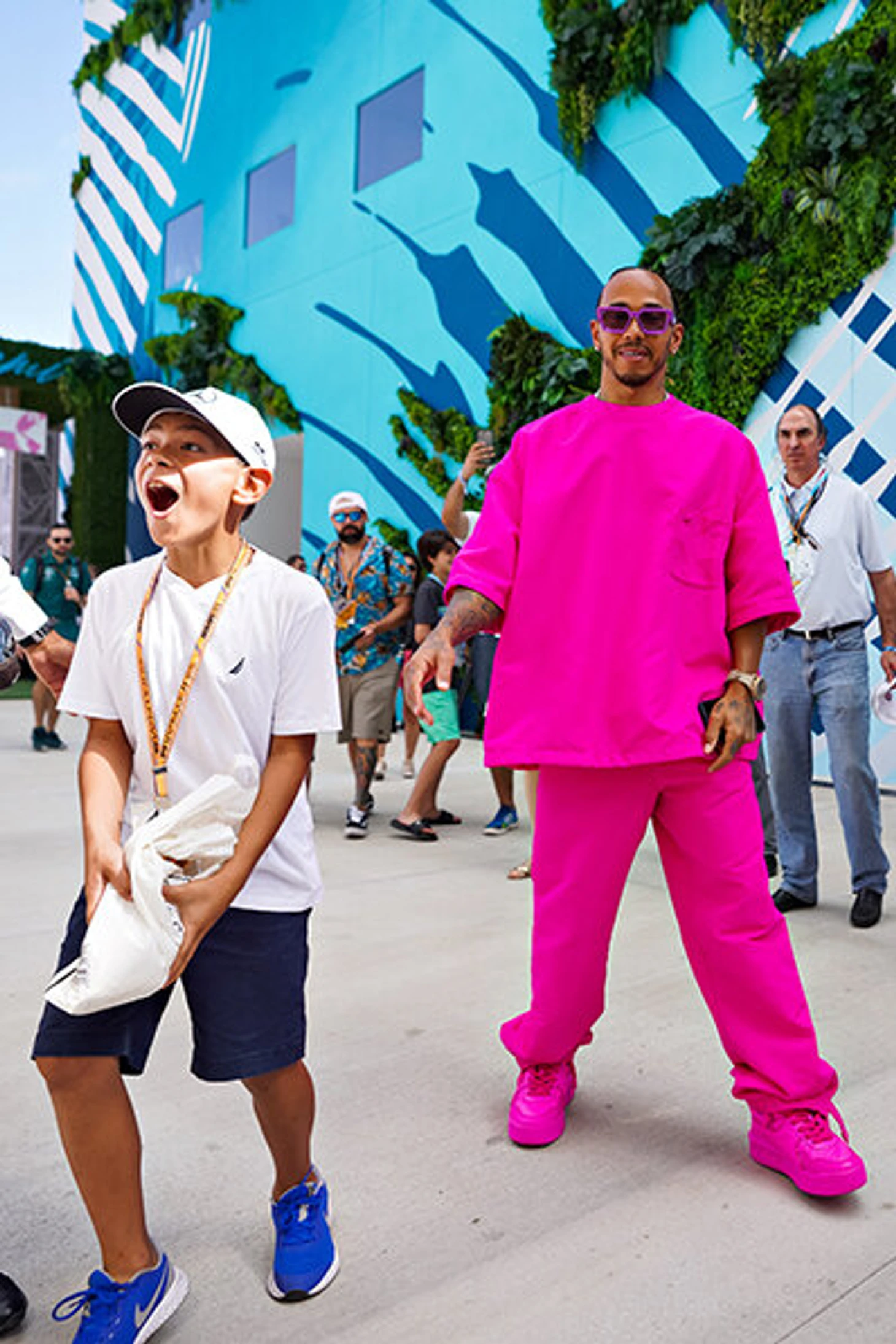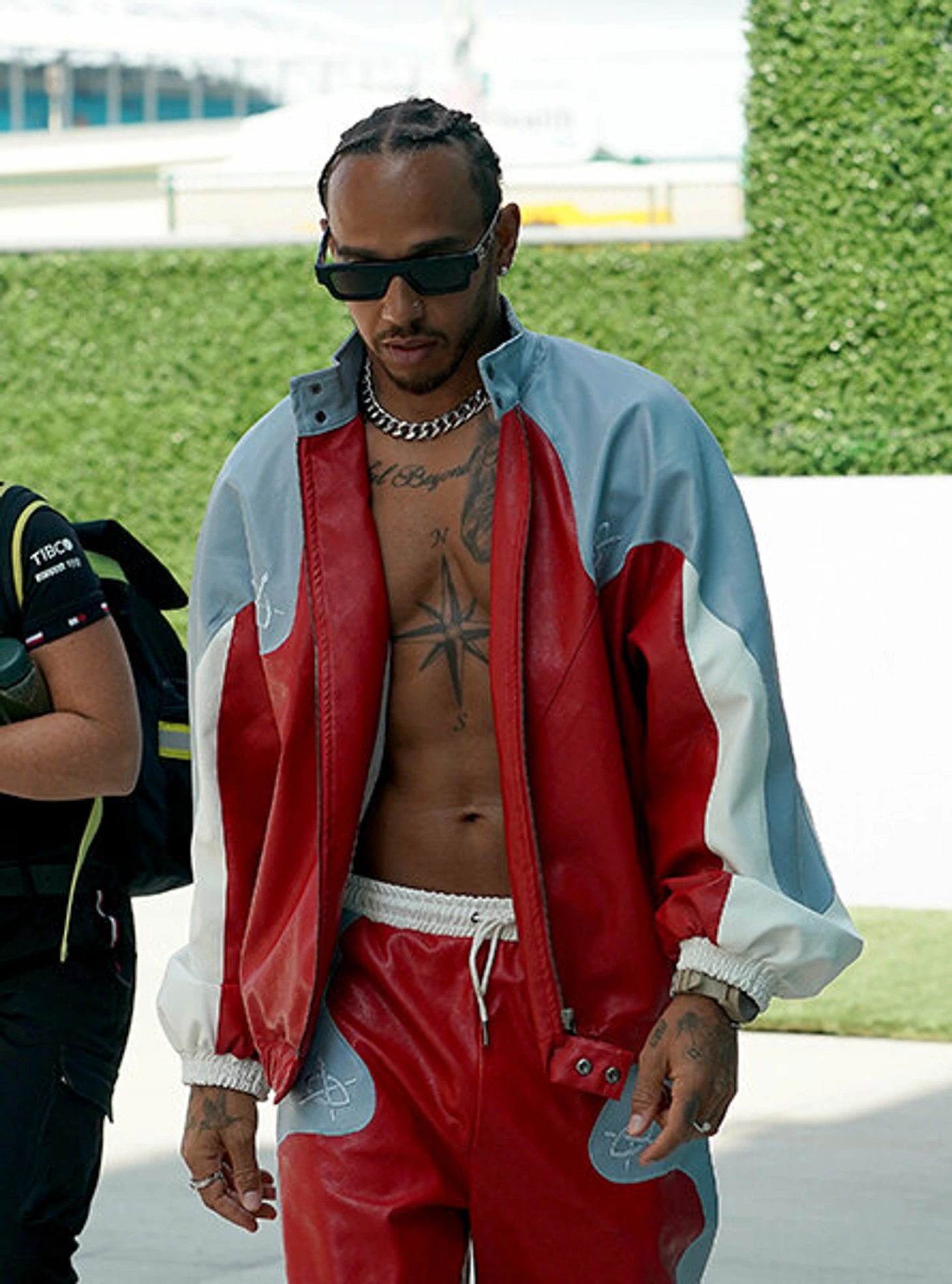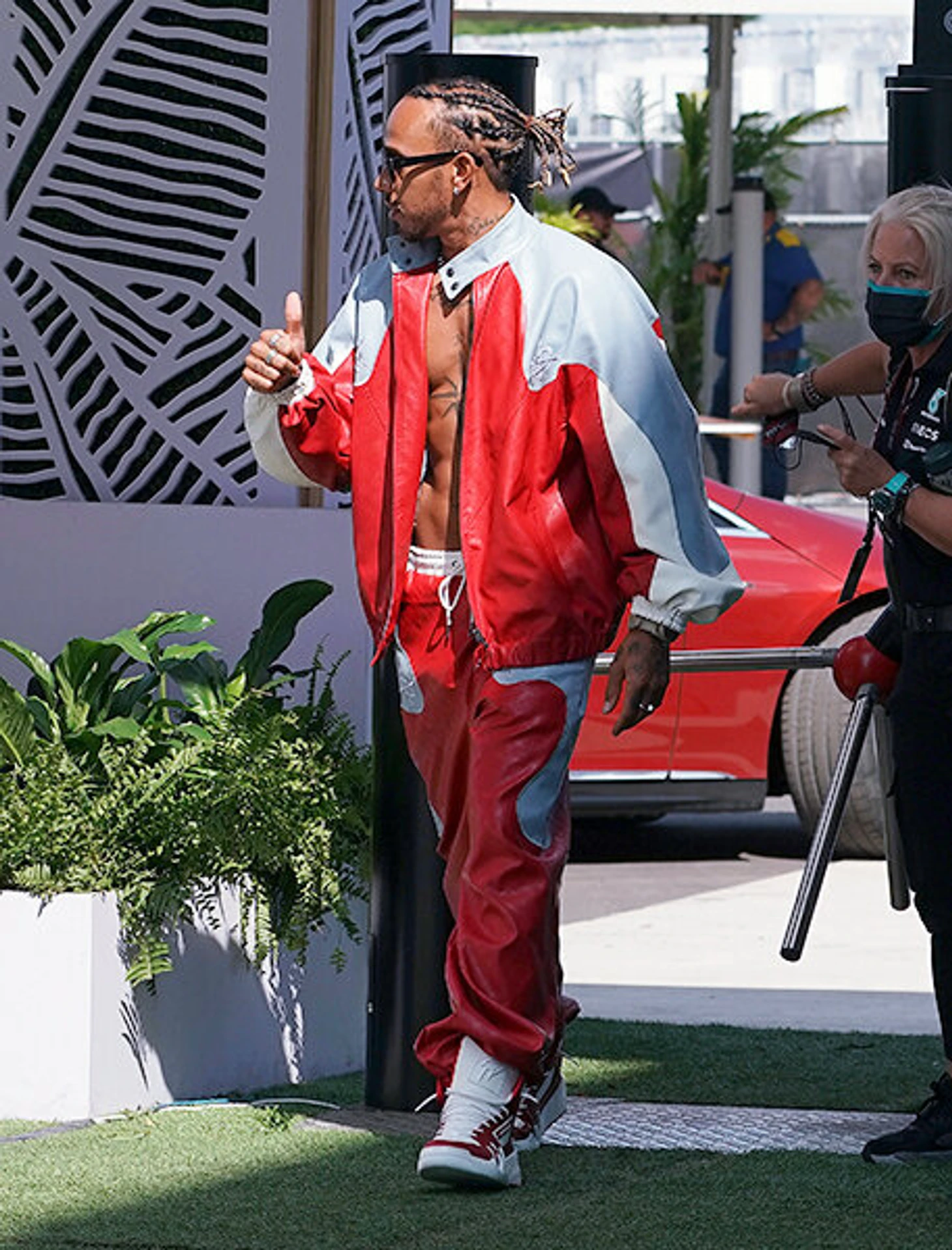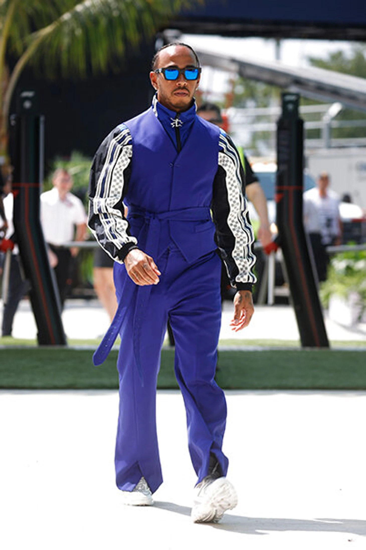 Кстати, британец с удовольствием наряжался весь уик-энд. Первое появление в паддоке Майами состоялось в эклектичном комплекте от Louis Vuitton: спортивная куртка за €2700, жилет классического кроя – €1500, вечерние брюки с разрезами – €990, кроссовки – €950. И только солнцезащитные очки другого бренда Off White – всего за €245.