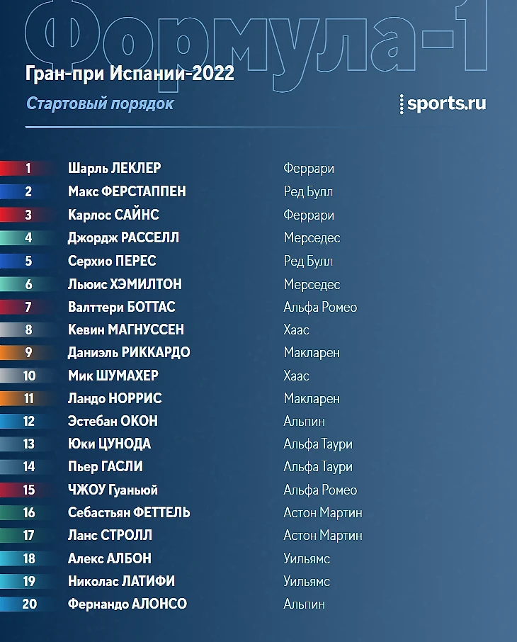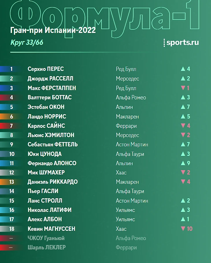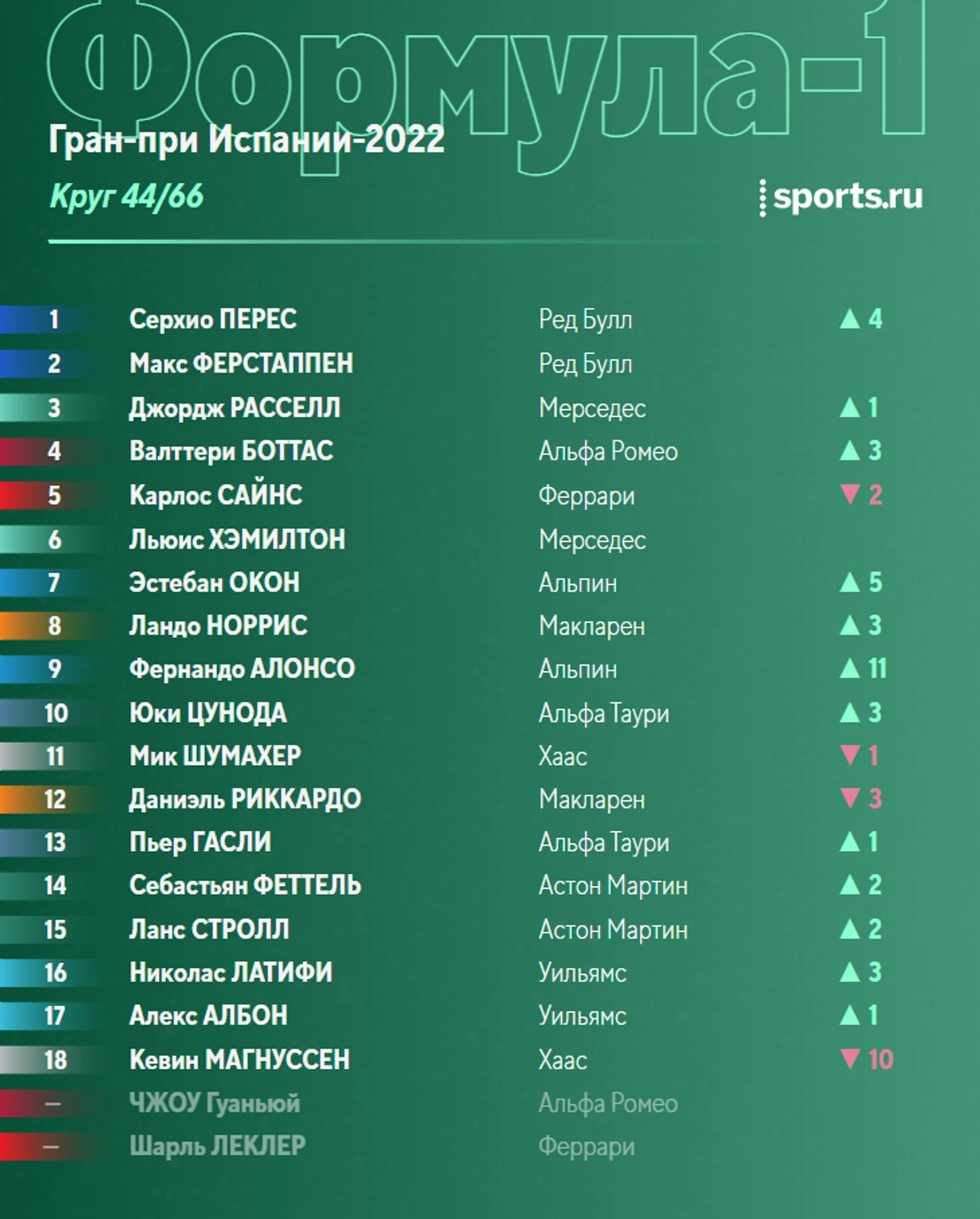1. Перес 2. Расселл +5,5 3. Ферстаппен +7,7