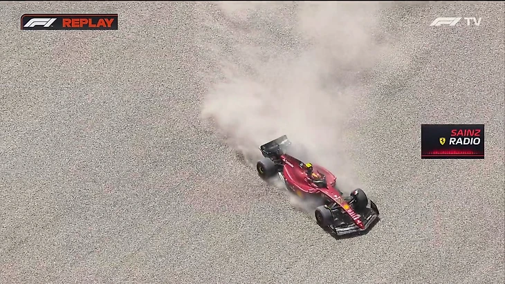 У-у-у! Сайнс потерял контроль на торможении перед четвертым поворотом - его развернуло и выкинуло в гравий. Испанец вернулся на трек, но только 11-м.