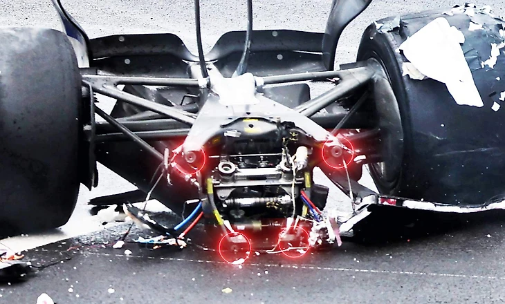 Теперь же на болты выпала нагрузка в несколько раз выше при массе данной части болида в около 450 кг. Технические правила не предполагают проверку предела их прочности за рамками тестовых стендов: по требованиям ФИА они должны разъединяться примерно на половине предполагаемой нагрузки, ведущей к их разрушению. Собственно, именно это и происходит болидами в ситуации аварий по касательной с большой нагрузкой: машина распадается на две половины, быстро убирая пресс на капсулы безопасности для сохранения бензобака и пилота в целости. Если бы пункт про разъединение двух частей болида отсутствовал, вся конструкция продолжила бы давить на шасси и вдавливать его дальше в барьеры.