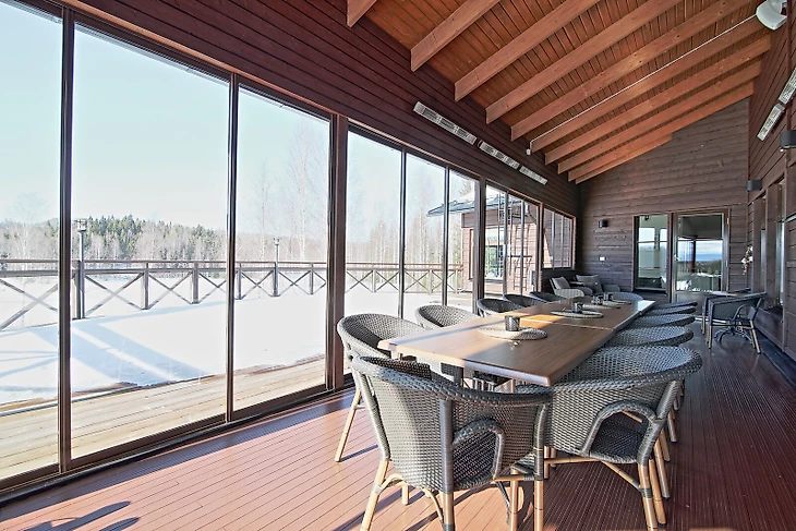 Еще у дома очень удачное местоположение: рядом поле для гольфа, элитный ресторан для гольфистов Golden Resort и современный фитнес-центр. Причем зимой лыжня начинается в 100 метрах от участка.