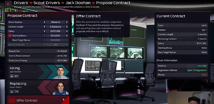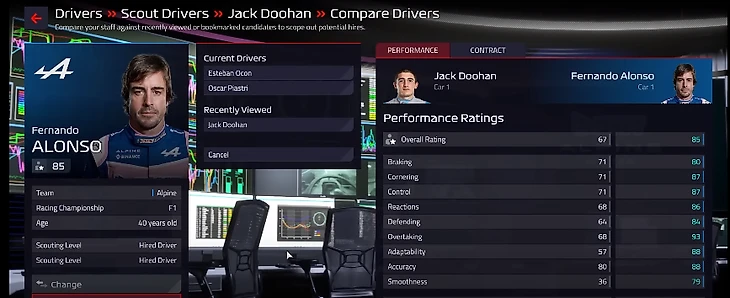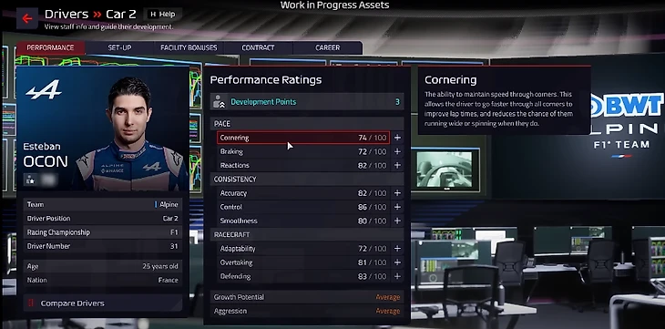 А как это будет работать? В неоднократно упомянутом футбольном менеджере у всех игроков есть скрытый потенциал, игрок может его не раскрыть, но перерасти эту скрытую цифру - нет. Здесь я вижу строчку "Growth potential", но как этот параметр будет работать? Если это обозначает только скорость роста характеристик, а предел в виде 100 единиц будет у всех пилотов, то это плохо. Из условного Рио Харьянто можно будет слепить гибрид Сенны и Проста. Да, это займёт больше времени, чем подписание топового юниора. Но сама по себе такая возможность - чушь. В том же самом Motorsport Manager из пилота с максимальным потенциалом в 3 звезды вы пятизвёздочного никогда не сделаете, вы сможете раскрыть его только на эти самые 3 звезды.