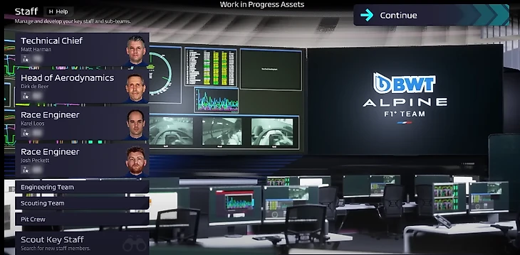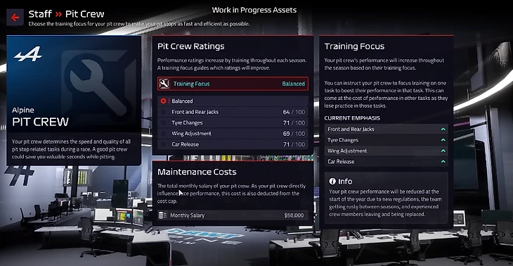 Здесь же – все настройки команды для пит-стопов, например: от уровня зарплаты механиков до степени прокачки навыков (скорость работы с передними и задними домкратами, замена колес, поправка угла атаки антикрыльев, выпуск машины). Вместе с возможностью выбора фокуса дополнительных тренировок: