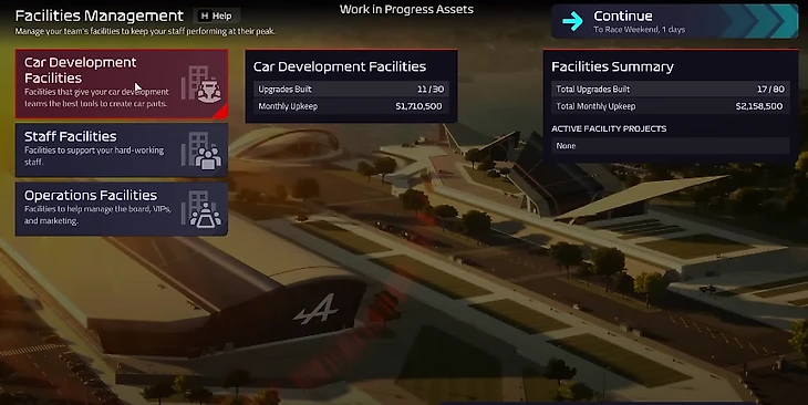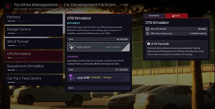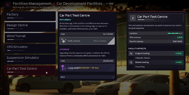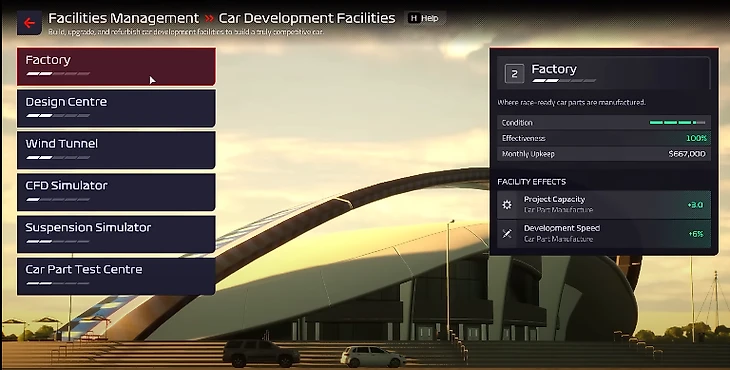 Мощности для развития машины разбиты на множество отделов: завод, центр разработки, аэротруба, симулятор вычислительной гидродинамики (компьютерный аналог аэротрубы), стенд для тестов подвески, центр испытаний деталей – у всего свои уровни состояния, эффективности, стоимости в месяц и влияния на производство деталей и апгрейдов: