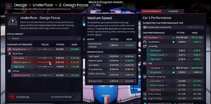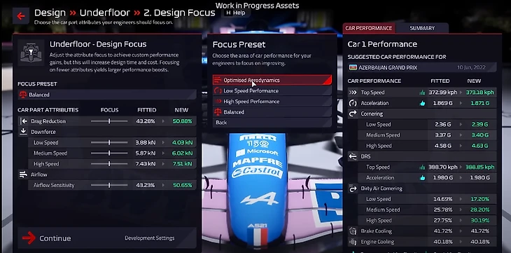 А вот окно выбора дальнейшего развития – можно самому определять направление: хоть снижение лобового сопротивления, хоть прижимная сила в среднескоростных поворотах, хоть эффективность аэропотока:
