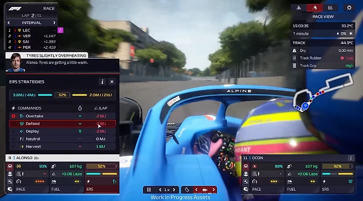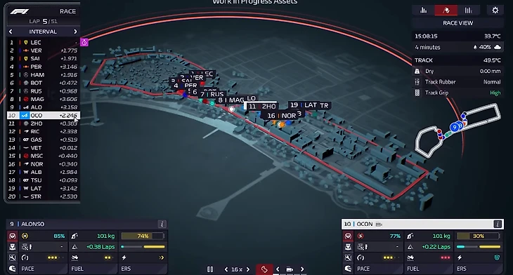 Для гонки – не меньше опций и информации: данные по использованию шин (процент, уровень агрессивности), топливо в наличии и проекция на момент финиша, степень атаки, уровень заряда аккумулятора и напор его использования – для обоих пилотов.