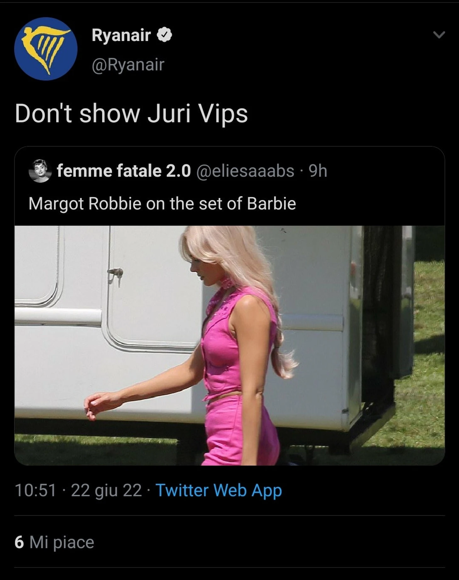 Во «флешмобе» издевательств над гонщиком поучаствовала даже ирландская авиакомпания Ryanair, перепостив фото Марго Робби со съемом фильма «Барби»: «Не показывайте Юри Випсу».